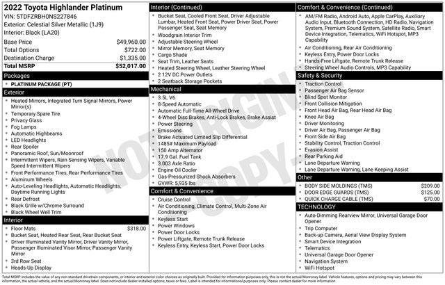This Highlander Platinum has been meticulously inspected and certified by our expert technicians, giving you peace of mind and confidence in your purchase. With its impressive 3.5L V6 DOHC engine, 8-speed automatic transmission, and AWD, this SUV delivers a smooth and capable driving experience, boasting an excellent 20 city/27 highway MPG rating.